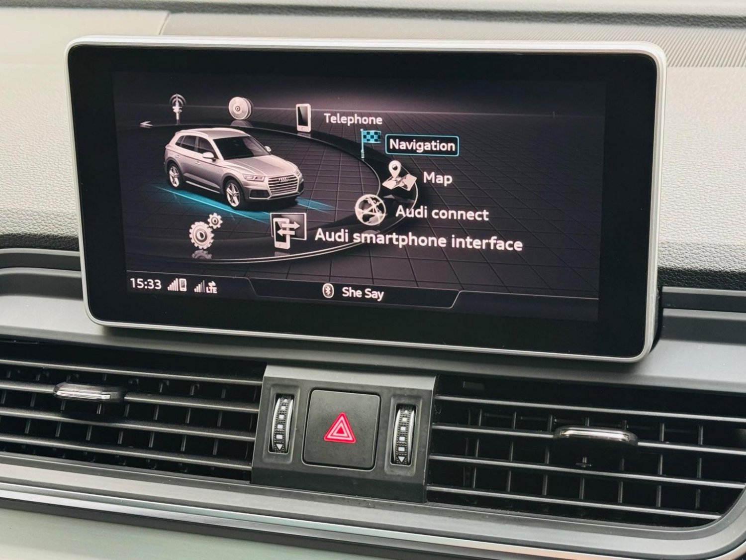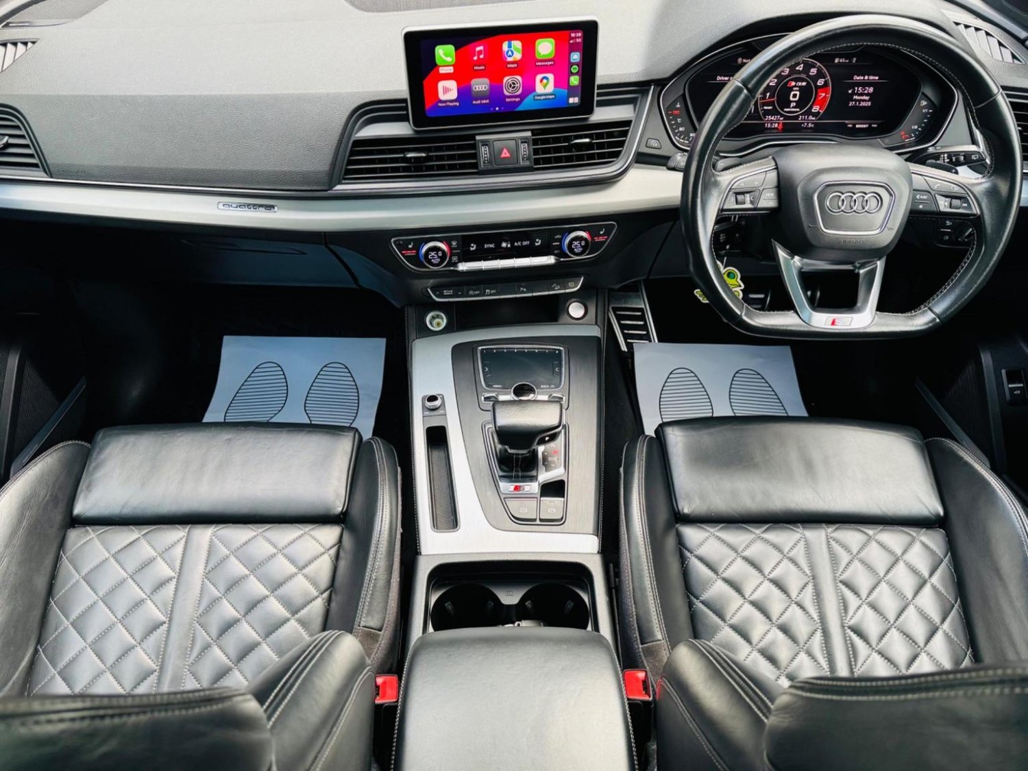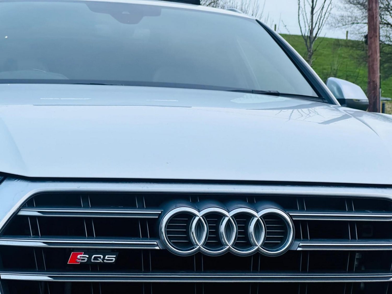 2 x SDXC Card Readers, 2 x USB Charging Ports and 1 x AUX-IN, 20in Alloy Wheels - 5-Twin-Spoke Star Design Contrasting Grey - Diamond Cut, 4-Way Electric Lumbar Support, 6-Airbag System, Aluminium Roof Rails, Aluminium-Effect Door Mirror Housings, Anti Theft Locking Wheel Bolts, Anti-Theft Alarm, Audi Beam, Audi Connect Infotainment Services - 3 Month Trial, Audi Connect Safety and Service - e-call, Audi Drive Select, Audi Parking System Plus, Audi Pre-Sense City, Audi Smartphone Interface, Audi Sound System, Auto-Dimming Rear-View Mirror, Automatic Headlight Adjustment, Bluetooth Interface, Brake Calipers Painted in Black with SQ5 Logo at the Front, CD Drive, Cloth Headlining in Black, Colour Drivers Information System with 7in Display, Contrast Stitching on Seats - Steering Wheel and Gear Lever Gaiter, Cruise Control with Speed Limiter, DAB Digital Radio, Deluxe 3-Zone Climate Control, Door Inserts in Matt Selenite Silver, Door Mirrors - Electrically Adjustable and Heated with Integrated LED Side Indicators, ESC - Electronic Stabilisation Control inc ABS - ASR and EDL, Electric Windows - Front and Rear, Electrically Adjustable Front Seats, Electromechanical Parking Brake, Electromechanical Power Steering, Extended Interior Upholstery Pack, First Aid Kit and Warning Triangle, Front Centre Armrest, Front and Rear Floor Mats, Gear Lever with Diamond S Badge in Black Perforated Leather, Headlights - High-Beam Assist, Heated Front Seats, High Multi-function 3-Spoke Leather Steering Wheel with S Badging and Aluminium Effect Paddles, High-Gloss Package, ISOFIX Child Seat Mounting and Top Tether, Illuminated Door Sill Trims with S Logo, Inlays - Matt Brushed Aluminium, Key with SQ5 Logo, Keyless Go, LED Headlights featuring Q Signature Design with LED Rear Lights and Dynamic Rear Indicators, LED Interior Lighting Pack, LED Rear Lights, Light and Rain Sensor, Luggage Compartment Cover, Luggage Compartment Mat, MMI Navigation Plus including MMI Touch, MMI Radio Plus with 7in Colour MMI Screen and MMI Controller, Non-Smoking Package, Pedals in Stainless Steel, Pop-Up Bonnet for Pedestrian Protection, Power Operated Tailgate, Privacy Glass with Acoustic Glazing For Front Windows, Radiator Grille in Matt Twilight Grey with Horizontal Matt Aluminium Struts, Rear Bench Seat Plus, Rear Spoiler, Remote Central Locking, Removable Luggage Compartment Floor, Removable Net Partition, S Dual-Branch Tailpipe Design in Matt Aluminium, S Instrument Dials, S Line Badges on the Front Wing Panels, S Line Front and Rear Bumpers, S Line Side Skirts, S Lower Front Air Inlet, S Rear Diffuser in Body Colour with Matt Aluminium Surrounds with Honeycomb Grille in Black, S Side Air Inlet Grille in Matt Titanium Black with Horizontal Inlays in Matt Aluminium, S Suspension with Damping Control, Seat Belt Monitoring, Side and Rear Windows in Heat-Insulating Glass, Split Folding Rear Seat Bench, Stainless Steel Loading Sill Protector, Tool Kit and Car Jack, Towbar Preparation, Tyre Pressure Warning Light, Tyre Repair Kit, Underbody Protection in Matt Selenite Silver, Voice Control System, Windscreen with Acoustic Glass, quattro On Demand